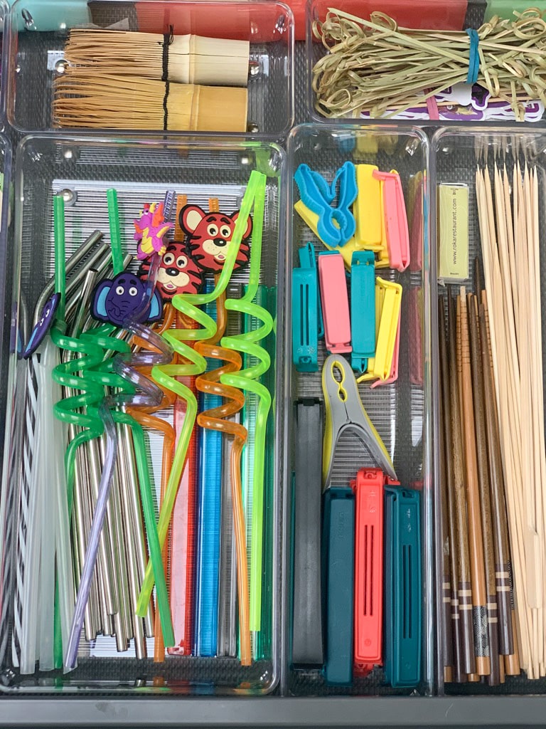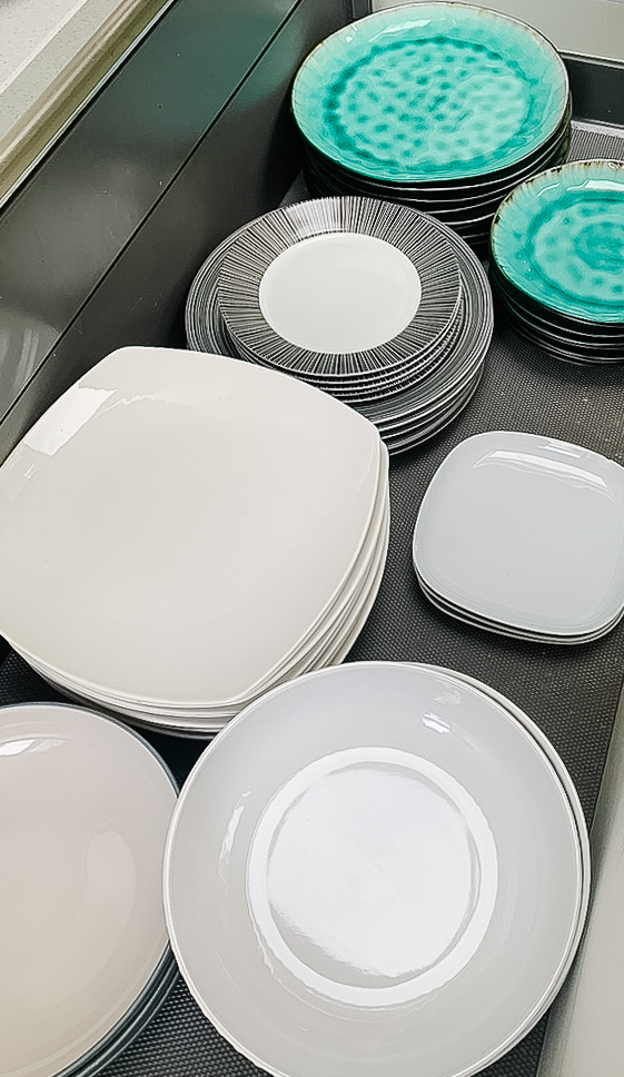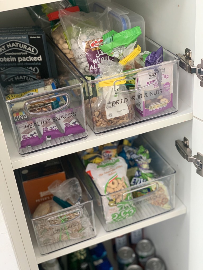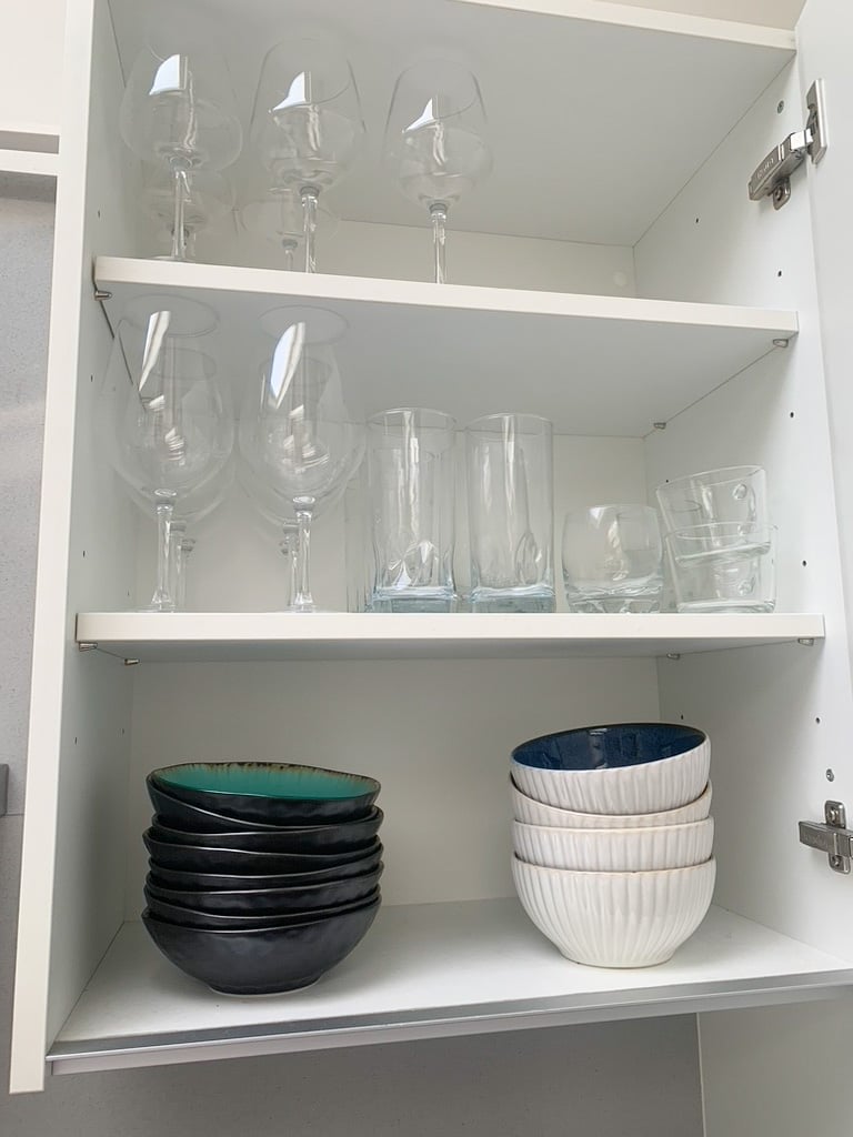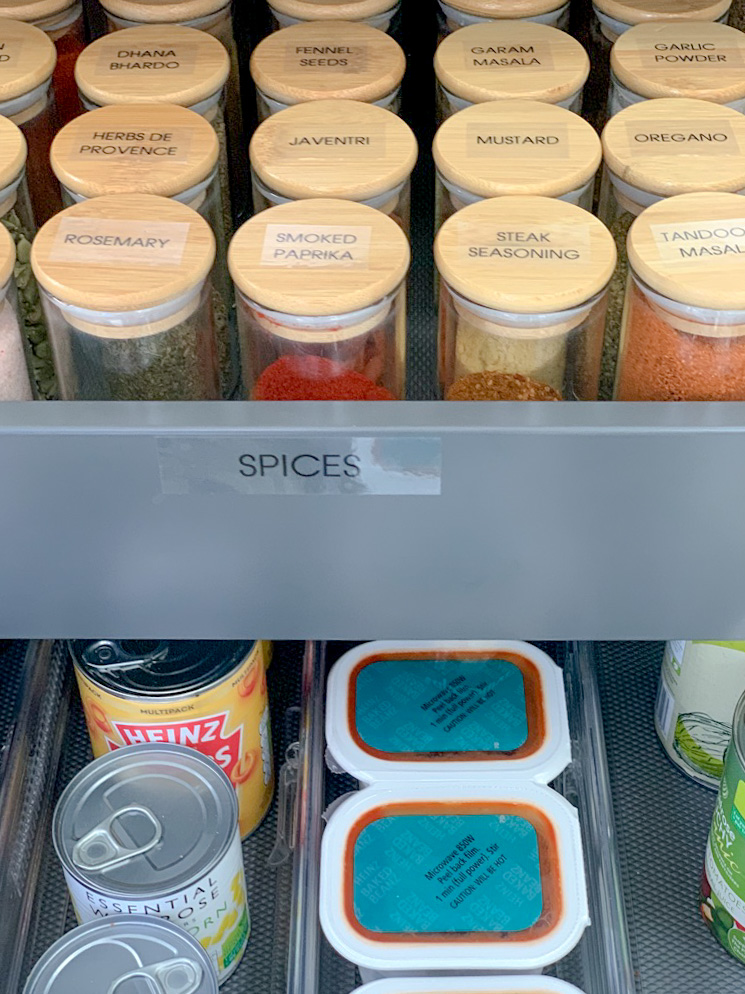 We redesigned the layout of the kitchen so there were clear distinctions between zones. We grouped ingredients together and used stackable decanter jars to maximise the use of space. The surfaces were left clear and minimalist to give a stylish finish.