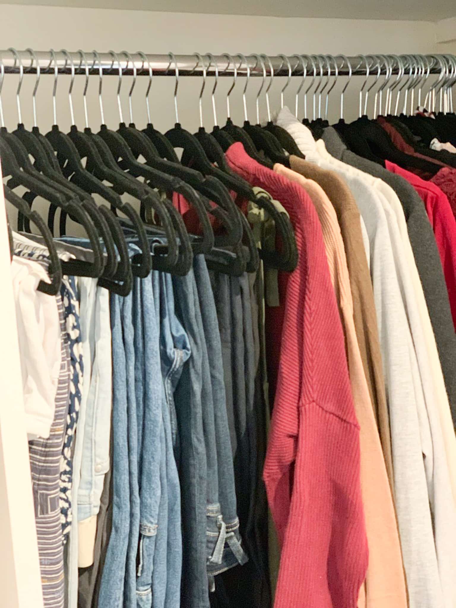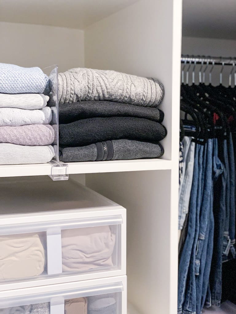 We used acrylic shelf dividers to separate items and create a smart and minimalist design. We also swapped out her old hangers for slim velvet ones to create uniformity and maximise the available space.
