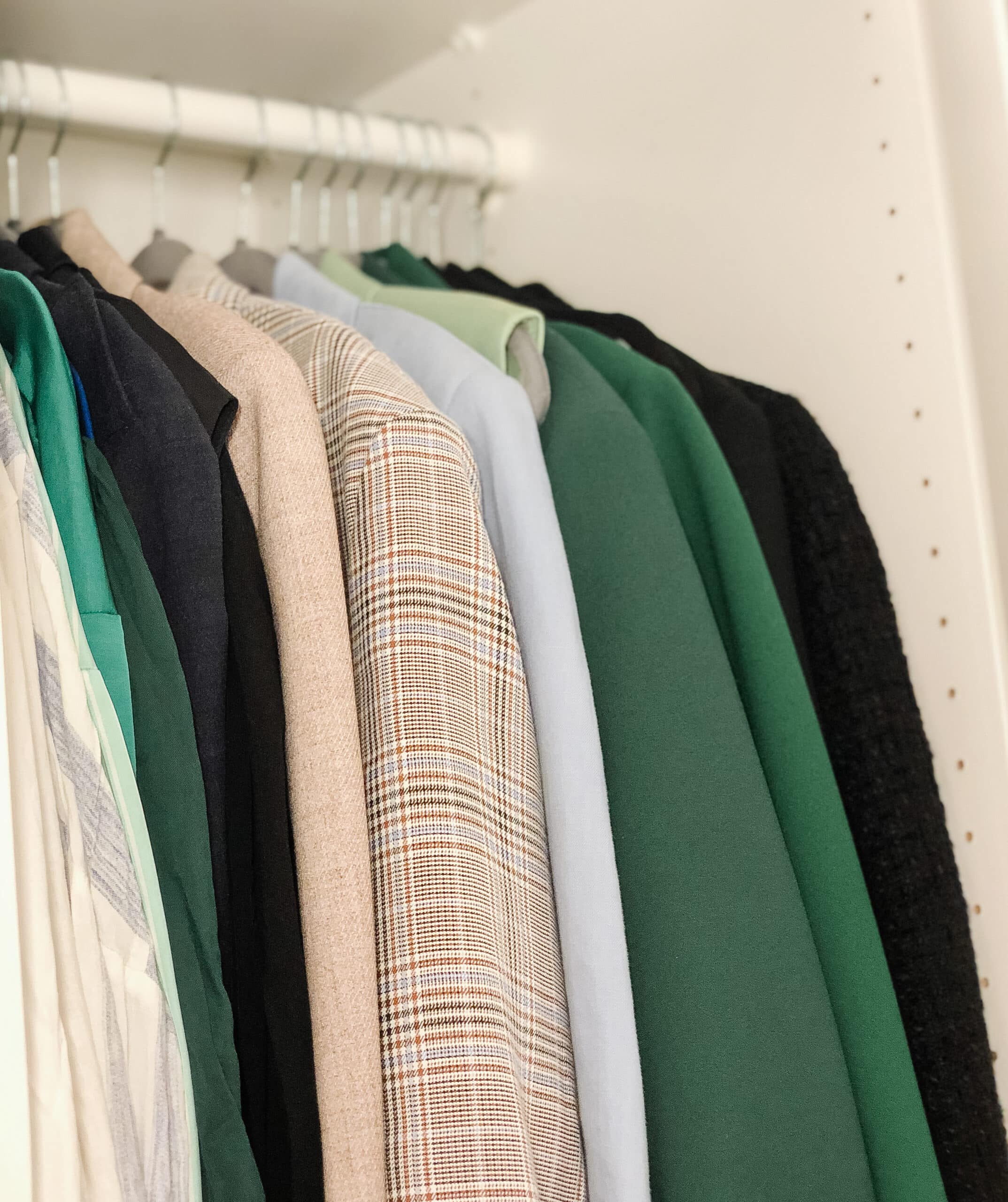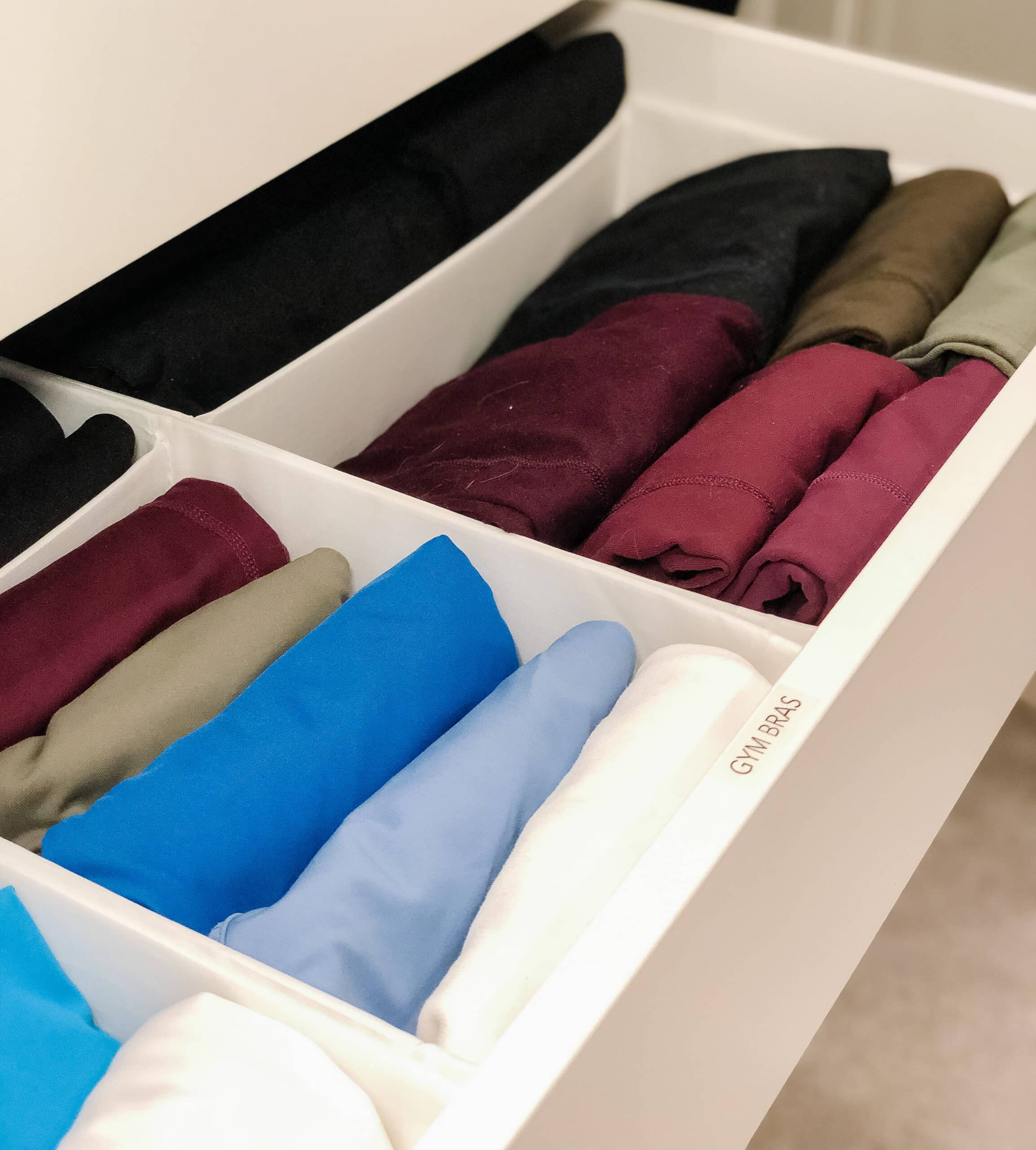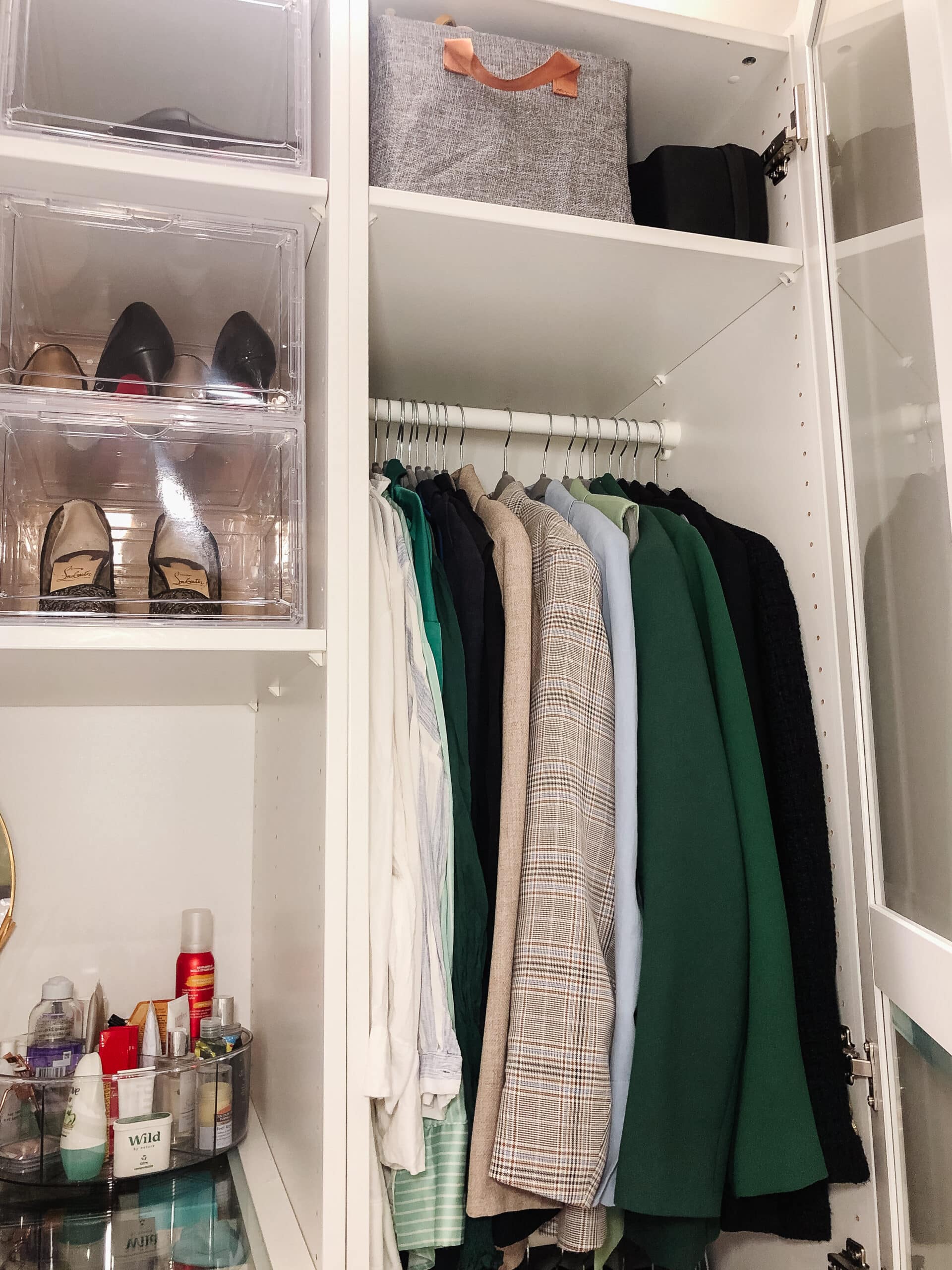 After an initial edit, we used drawer inserts to add structure to drawers and divide up categories. For higher up shelves we used wardrobe boxes to make items easier to access and added stackable shoe boxes. Colour-coding the hanging space created an attractive display that brightened up the space.