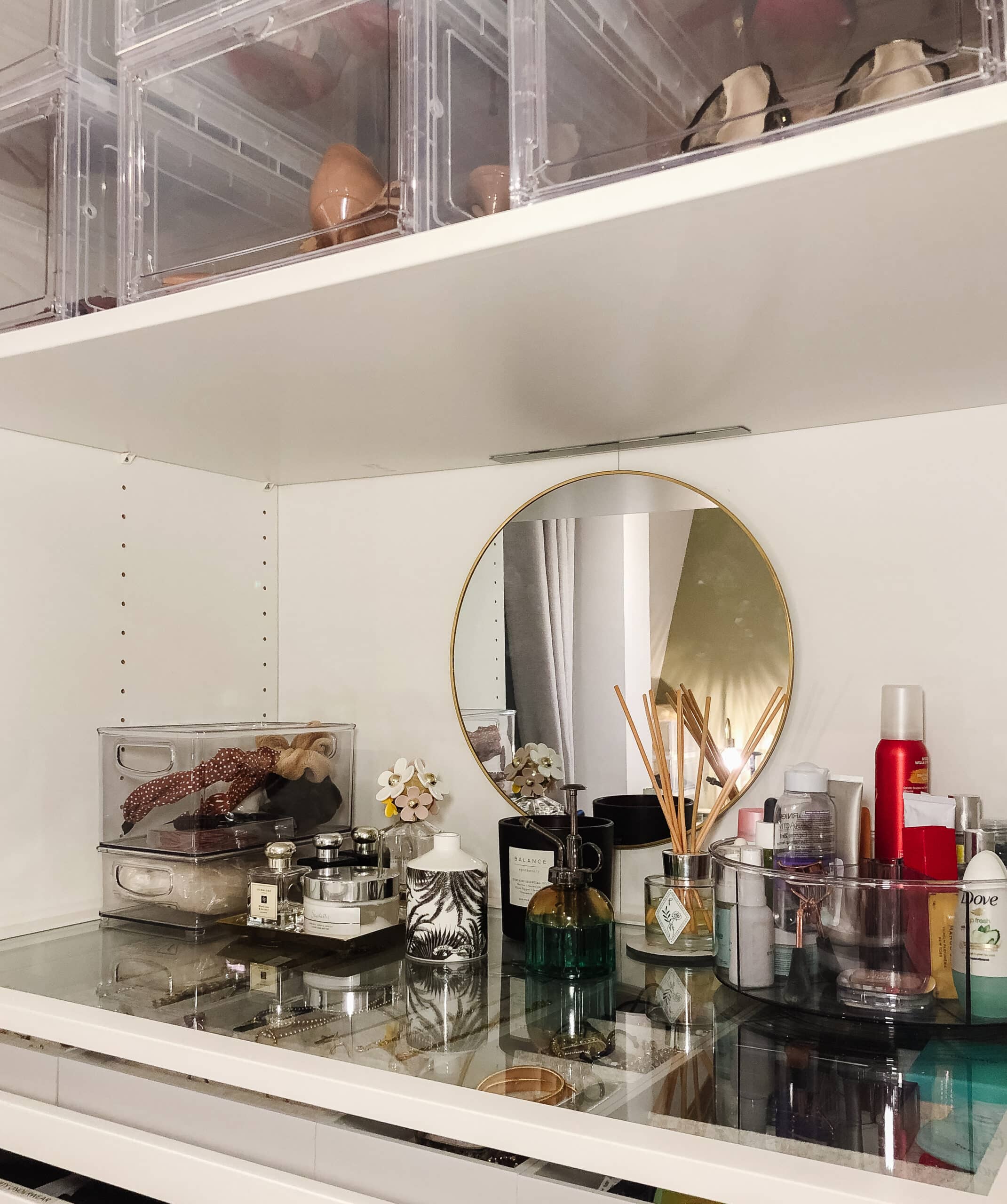 We added jewellery inserts into the wardrobe to store our clients jewellery and accessories. This helped protect her favourite pieces and made a beautiful display under the glass top.