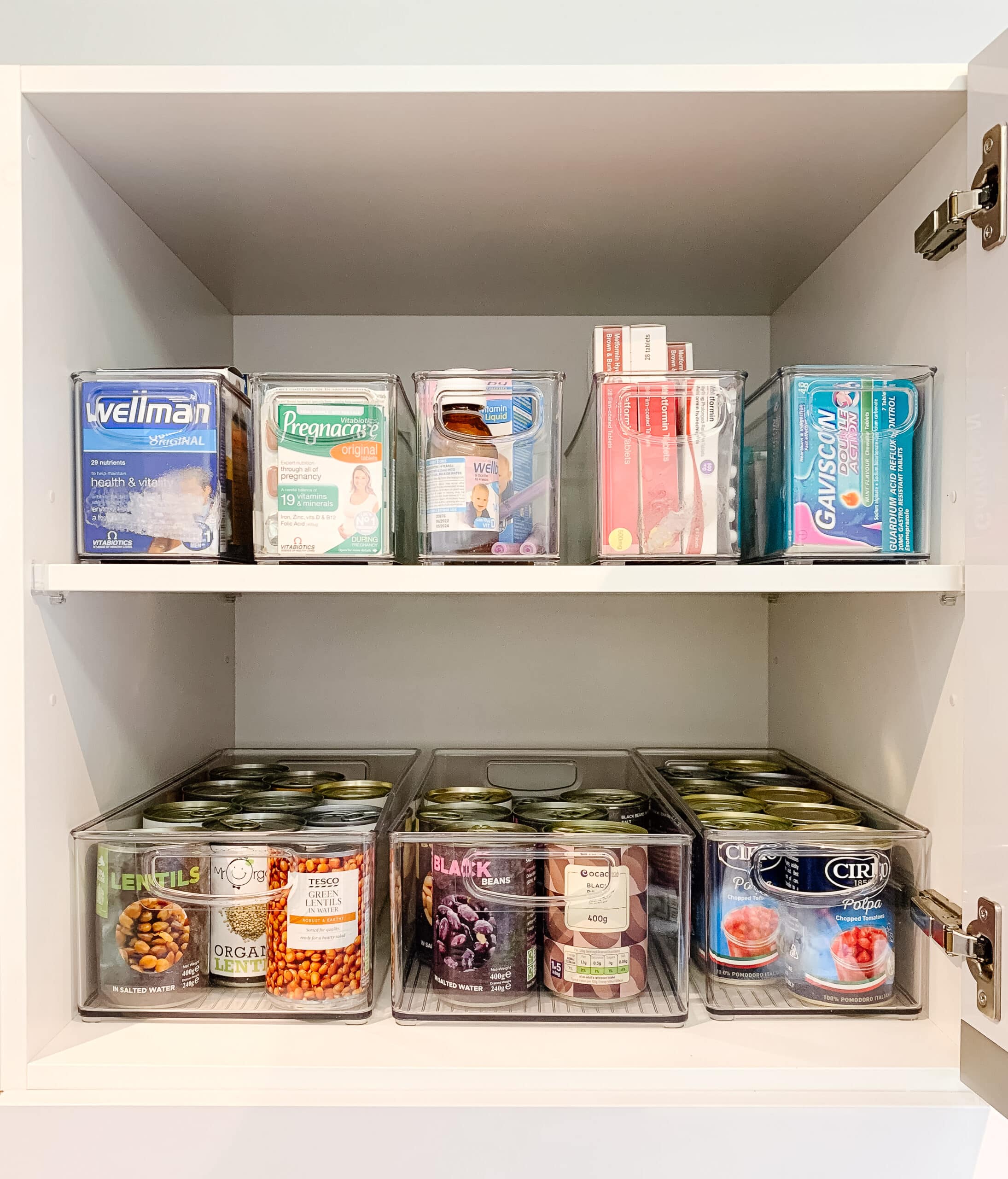 We created a tea and coffee station above the kettle and moved the crockery and glasses above the dishwasher to help speed up her morning routine. The kitchen had deep cupboards so using pantry boxes that utilised the whole space created extra storage that was easy to access.