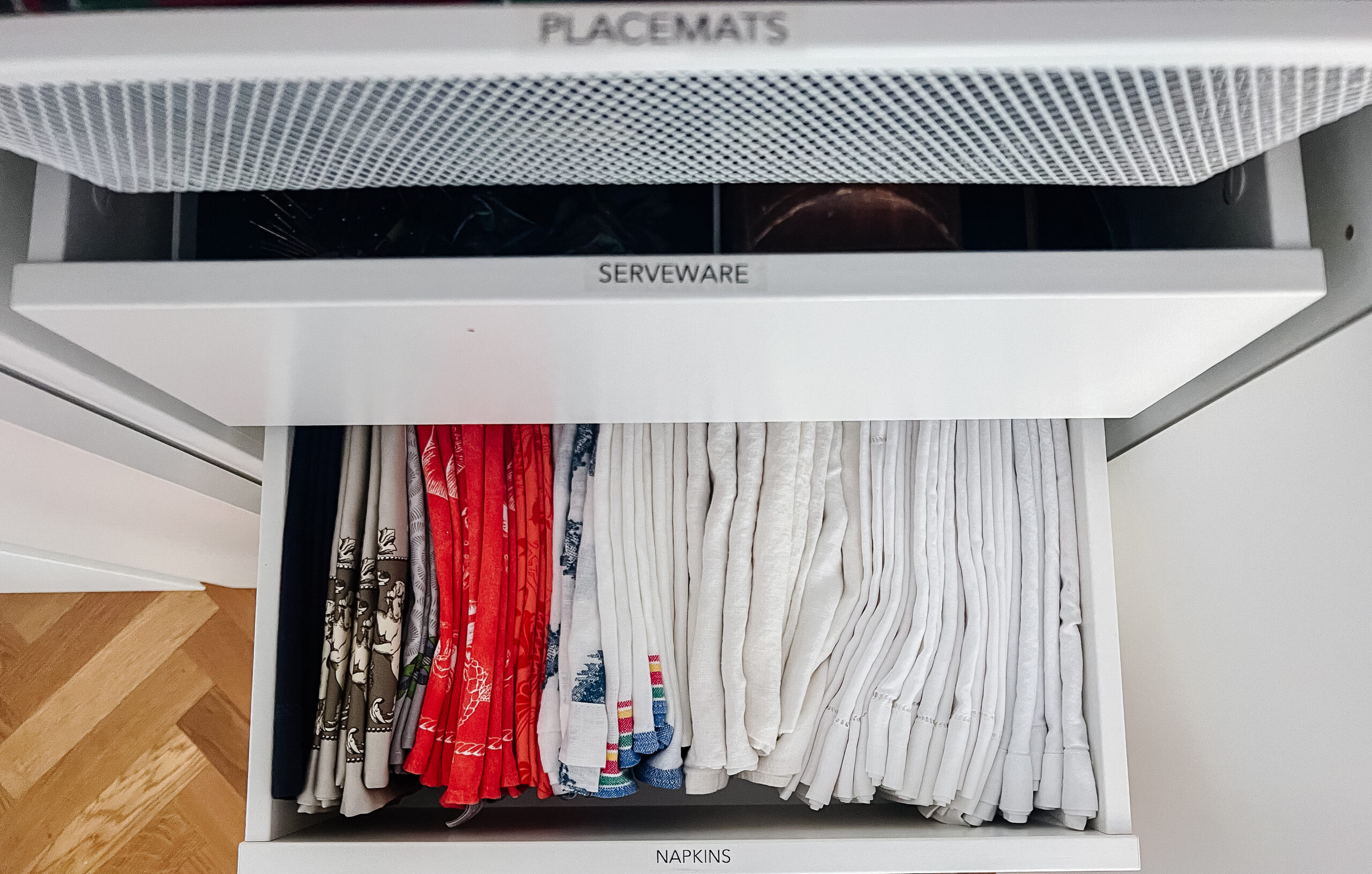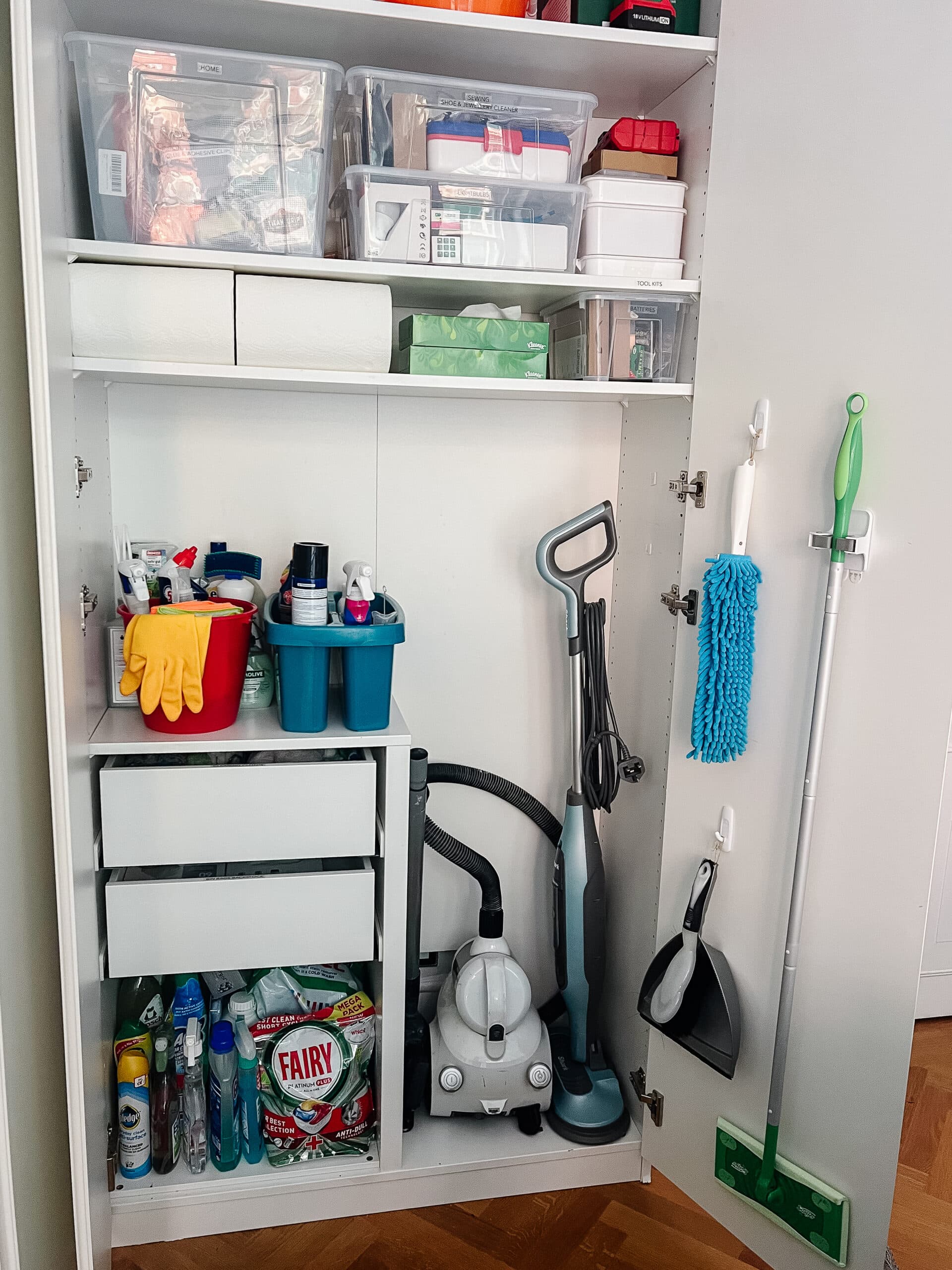 Our client and her family had recently relocated from Berlin into an apartment in Notting Hill. The smaller layout of the apartment meant the dining room cupboards needed to store all the cleaning and home products, linen, serving dishes and drinks backstock, so they had to be really efficient and streamlined.