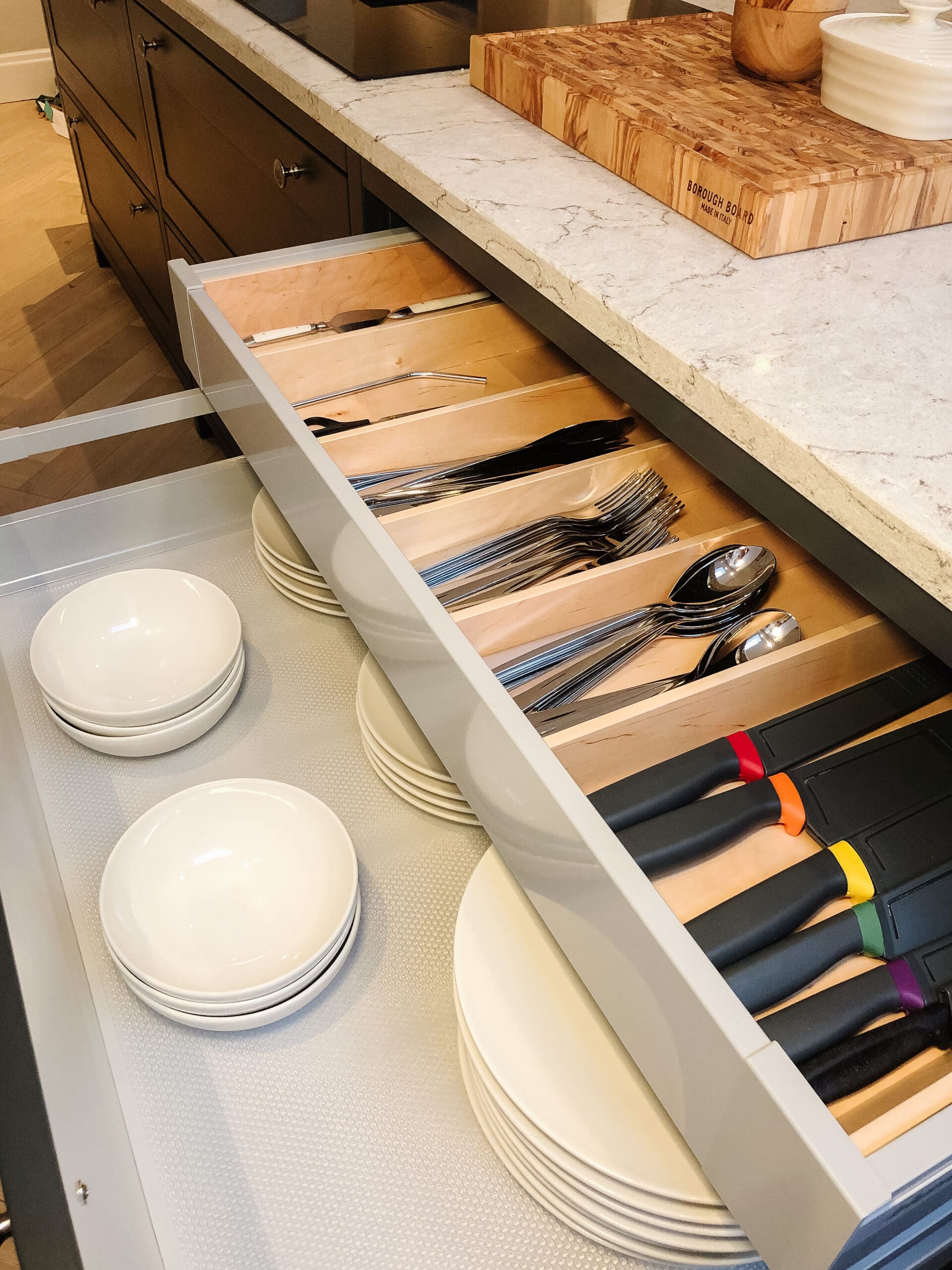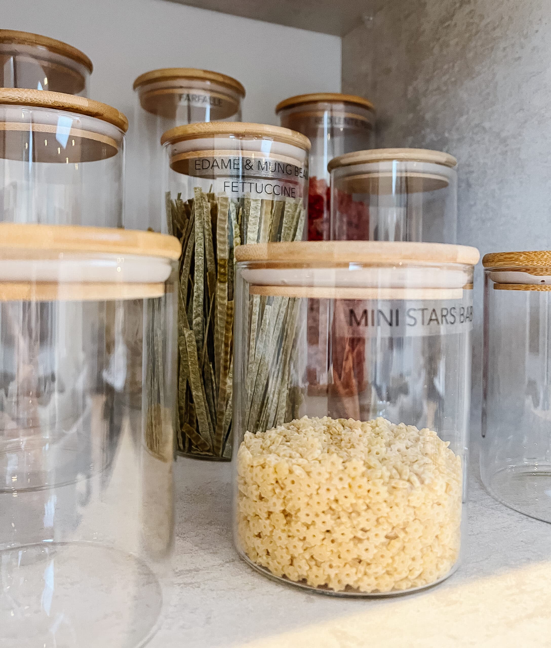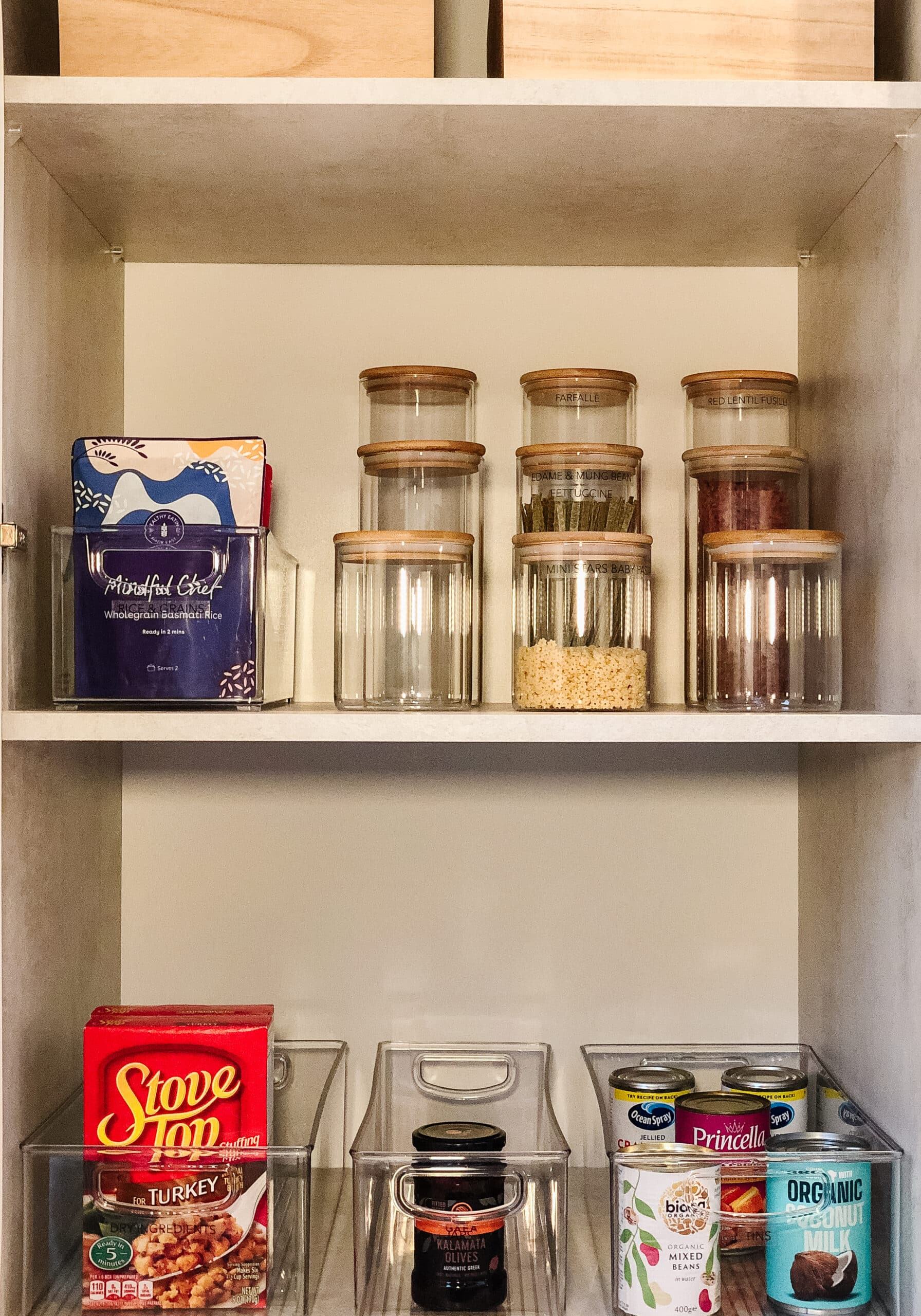 In the kitchen, we created clear zones for cooking, pantry, kids and cleaning so categories were concentrated together and daily tasks would be simple. There was lots of deep shelving so using pantry boxes to store dry ingredients made them easier to access and meant nothing could get lost at the back of the shelf.