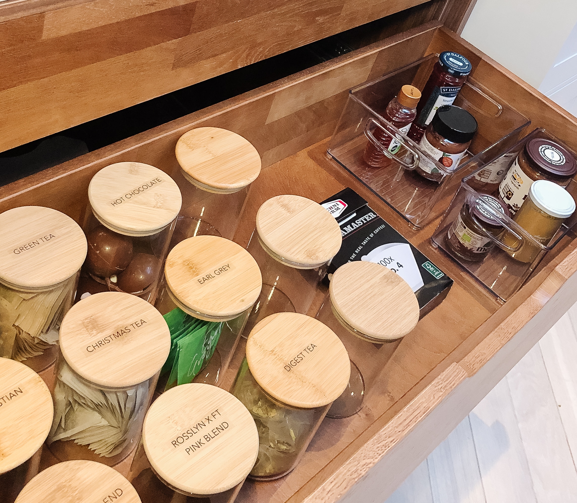 To create a breakfast station, we decanted teas, coffees and cereals and placed them next to the coffee machine and kettle so everything for breakfast was in one place.