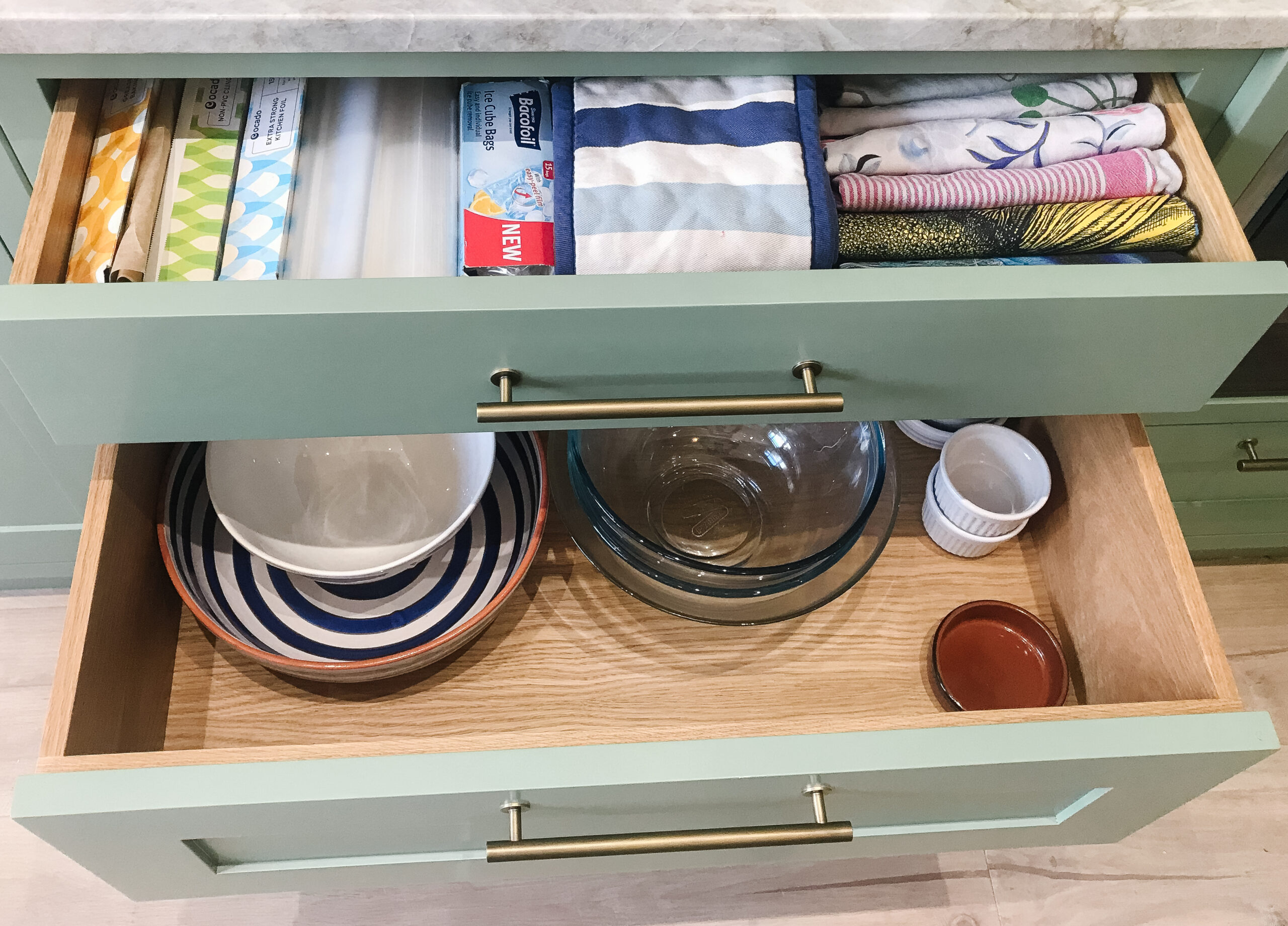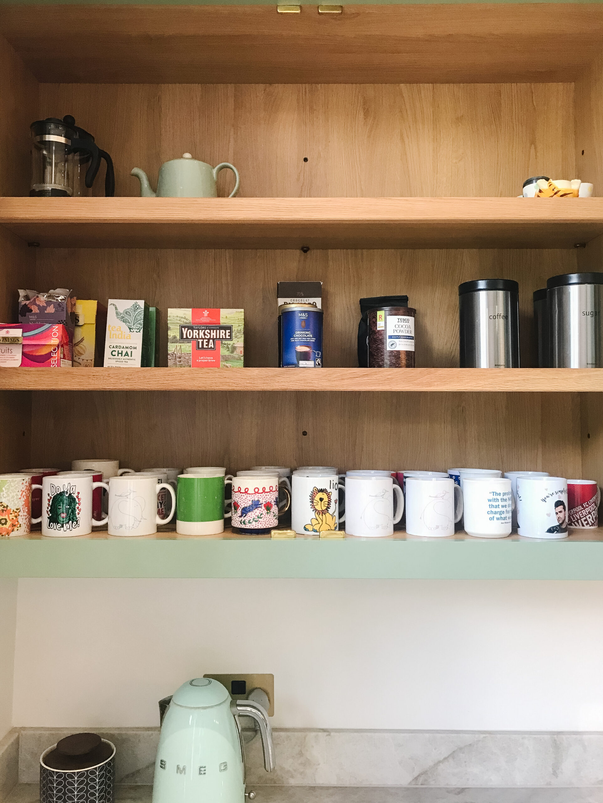The kitchen had a built-in pantry which we unpacked and organised so categories were clearly divided and easy to see. We created a tea and coffee station above the kettle so daily routines were streamlined and surfaces were kept clear for a beautiful finish to the kitchen.