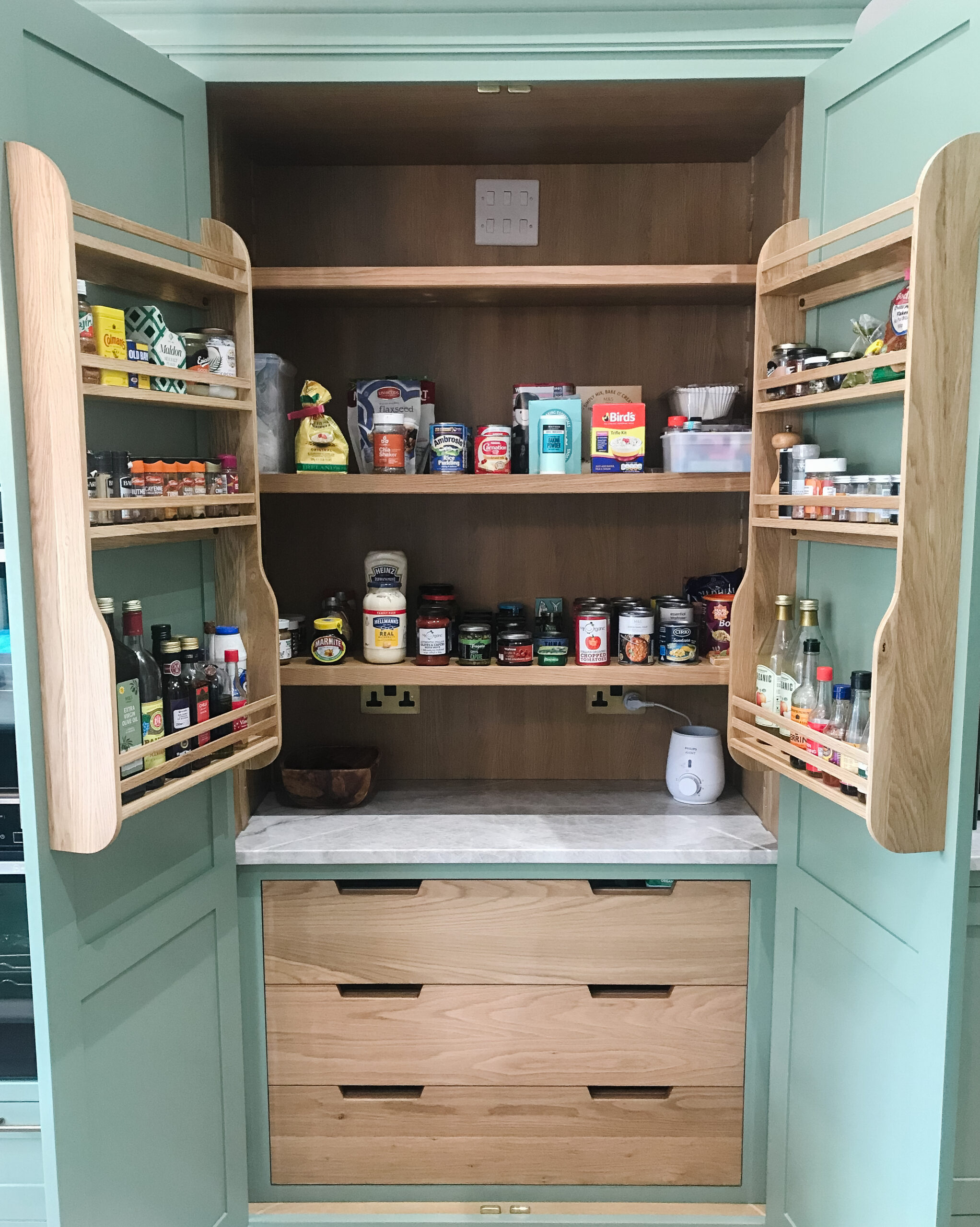 With a young family, including a brand new baby, our client needed the kitchen, utility and linen cupboard to be functional with clear zones so items were easy to locate. The renovation was still going on so the focus of the project was creating a layout that factored in storage for ingredients and items that hadn’t yet been bought.