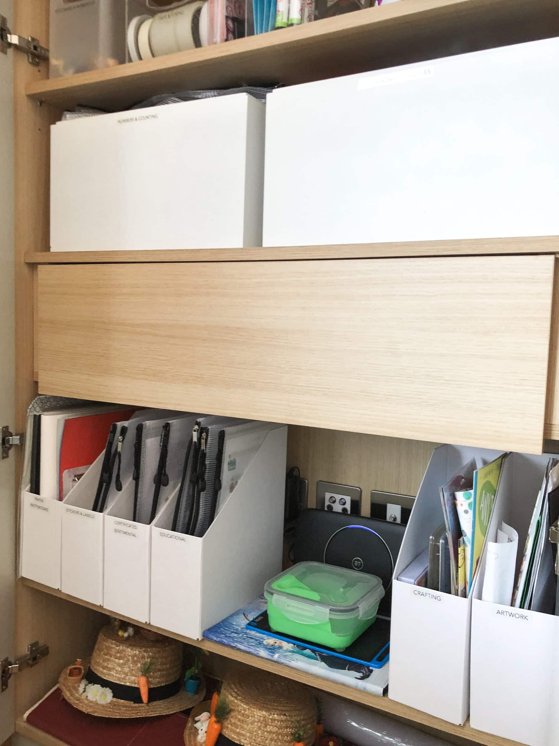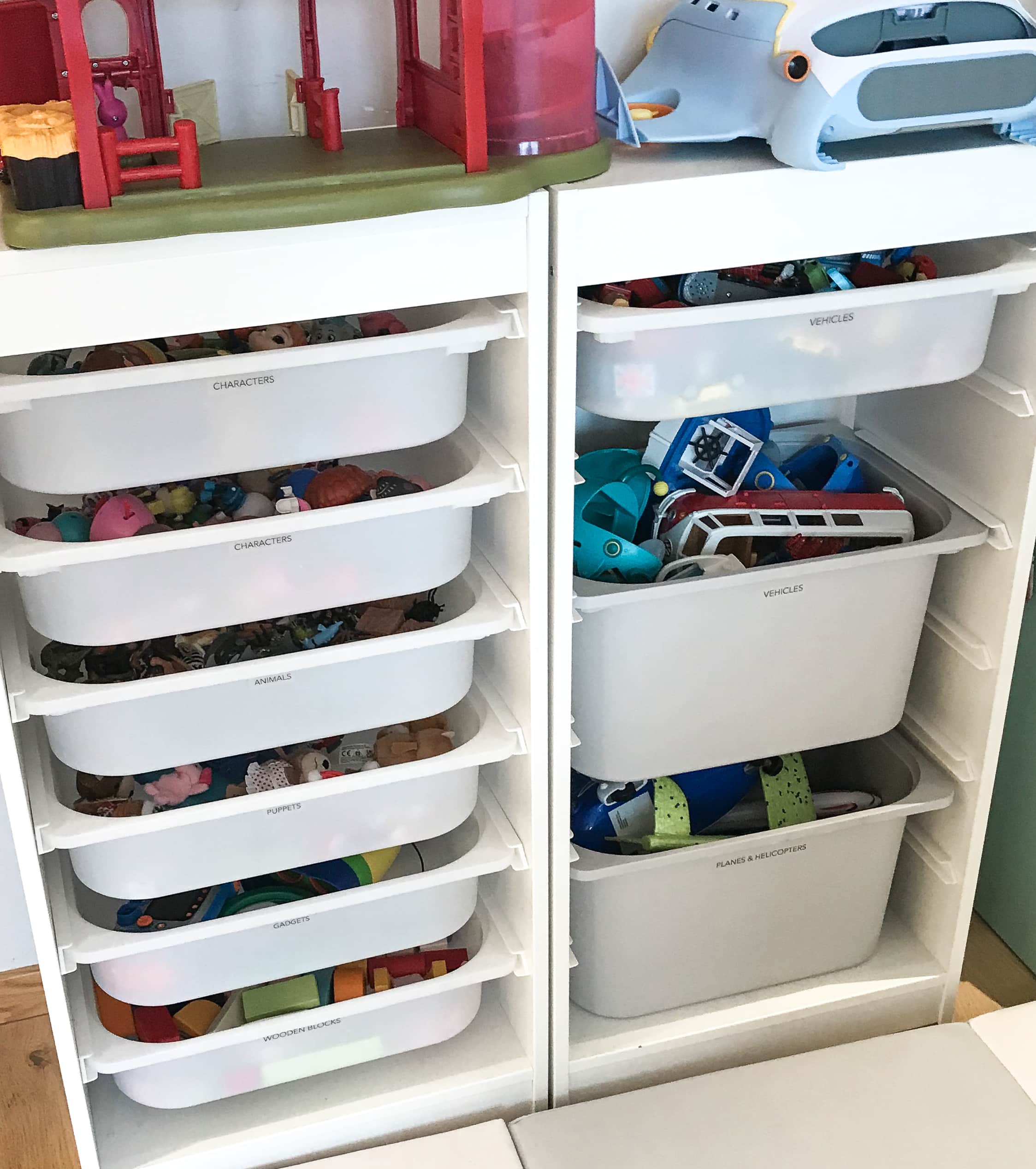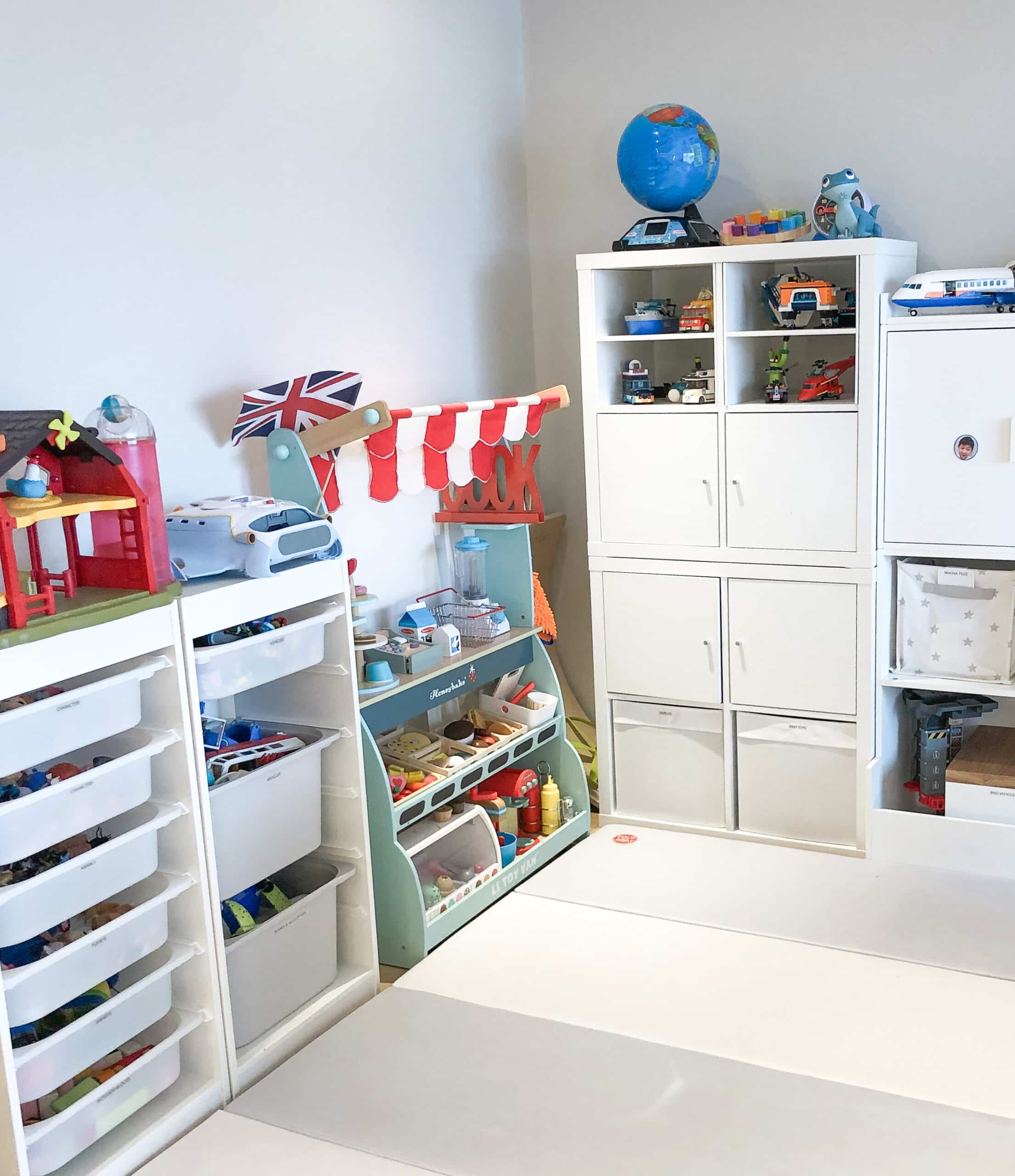 After an edit of the toys, we rearranged the layout of the room to create a defined play area. To make tidying up easier, we categorised the toys and used a mixture of big fabric boxes and pull-out drawers to store them in.