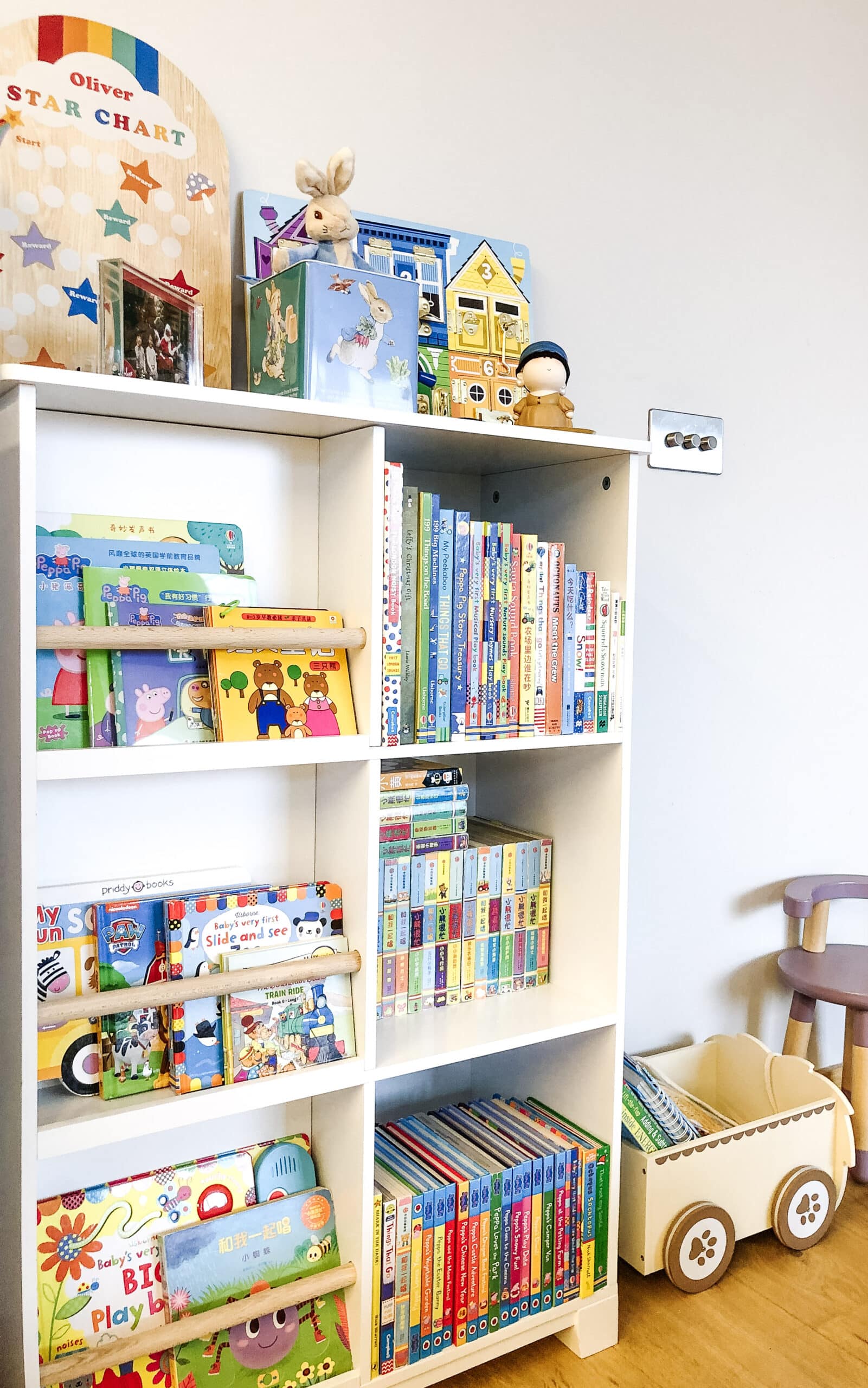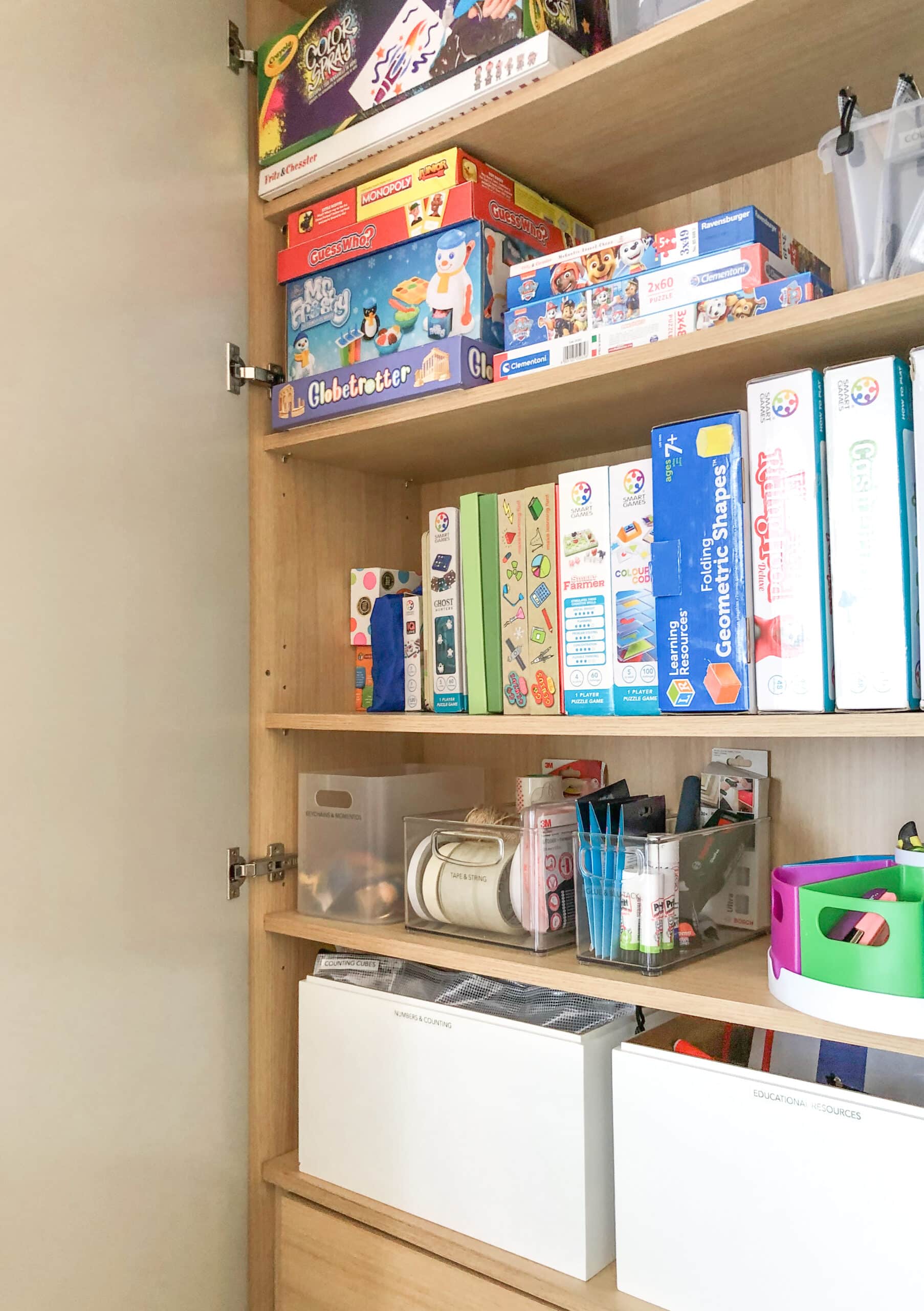 With two young children, toys tended to spread all over the sitting room. Our client wanted to create a clear play area, so the rest of the space could be hers. She also wanted the art supplies and board games to be separate from the toys and stored out of the way.