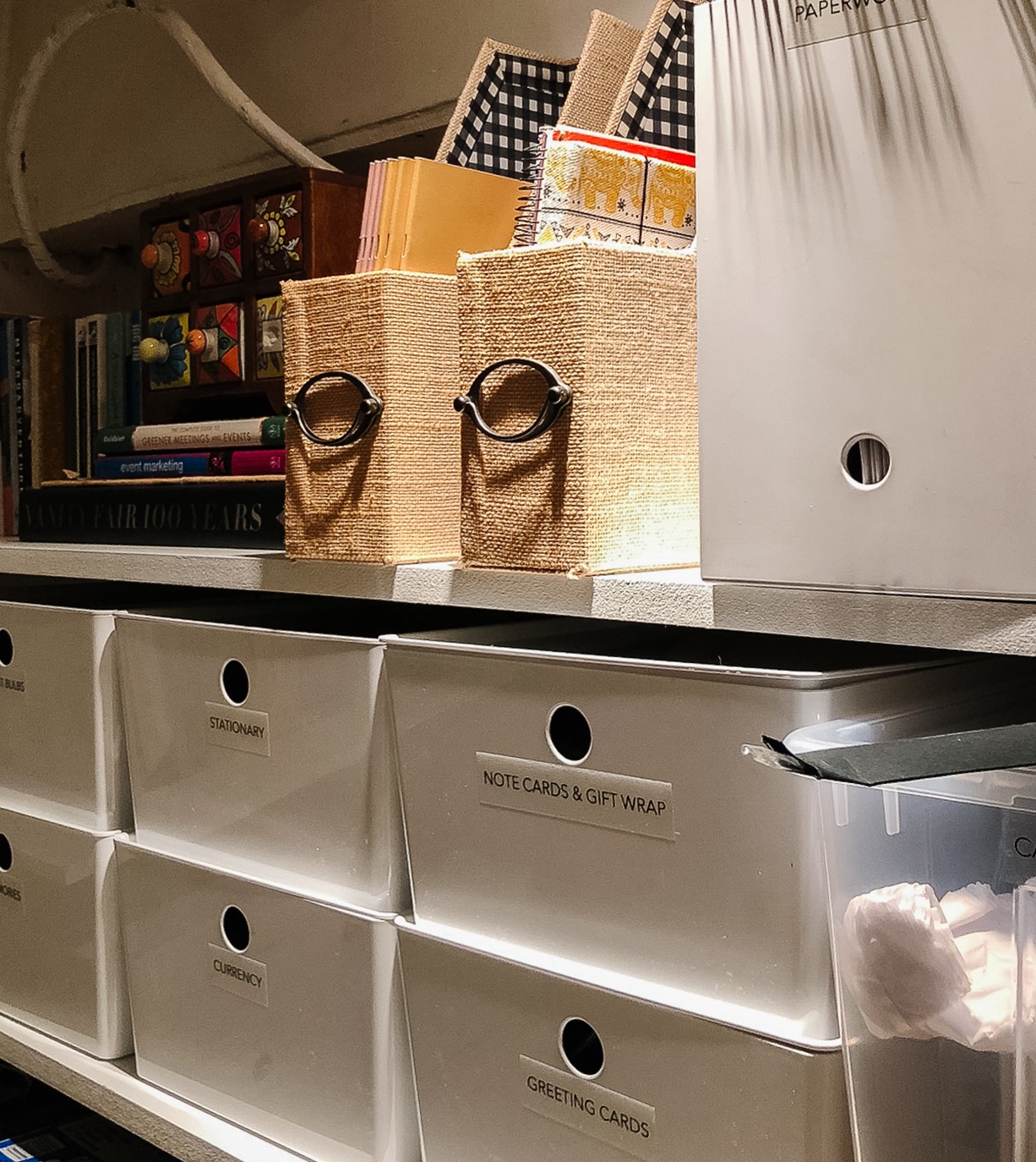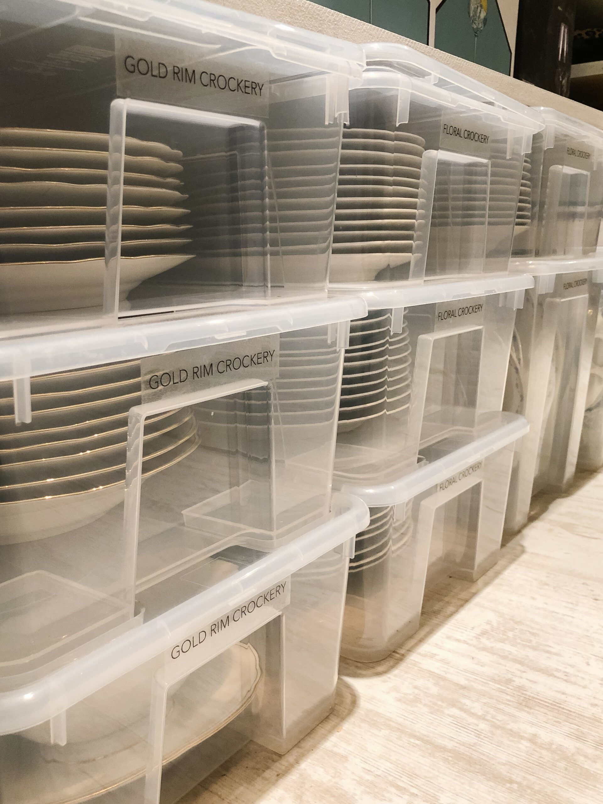 Clear lidded boxes were used to store her crockery so it was protected and easy to see. They stacked on top of each under the shelves which freed up extra floor space.
