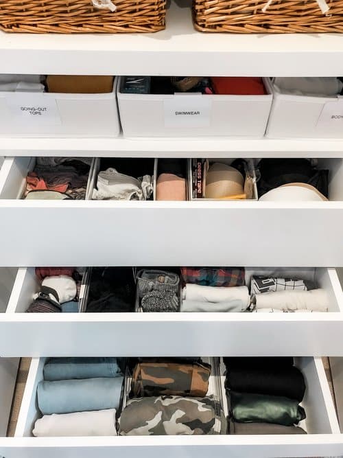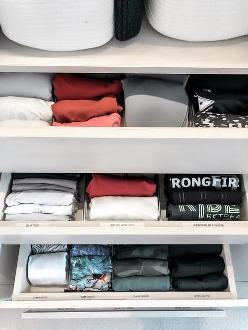 Being able to see what you have is crucial in an organised wardrobe. File folding as it makes it so much easier to see everything at a glance but sometimes it’s tricky to determine what is what if colours or styles are very similar. By dividing up the tops into sleeve length, separating them with drawer dividers and labelling each section, we created a really effective way for our client to choose her clothes, saving her time every day.