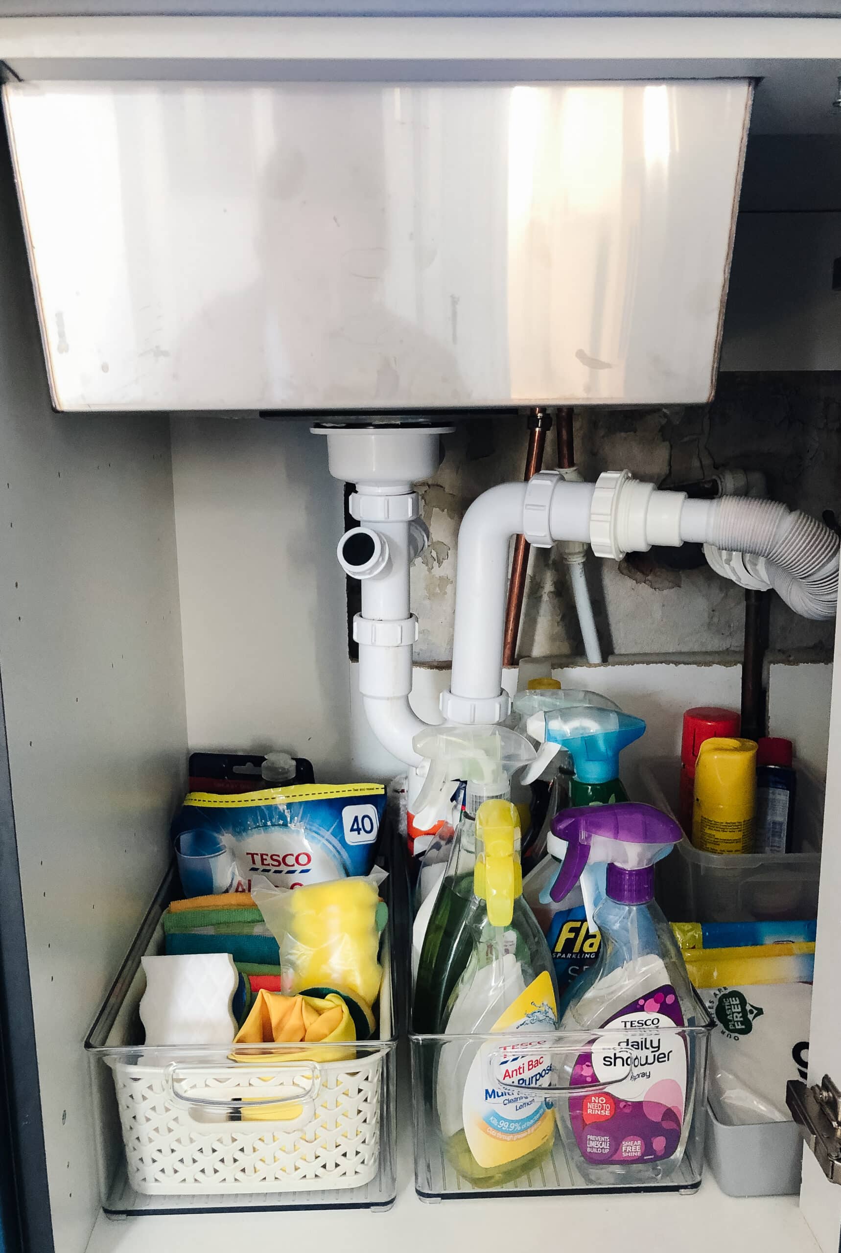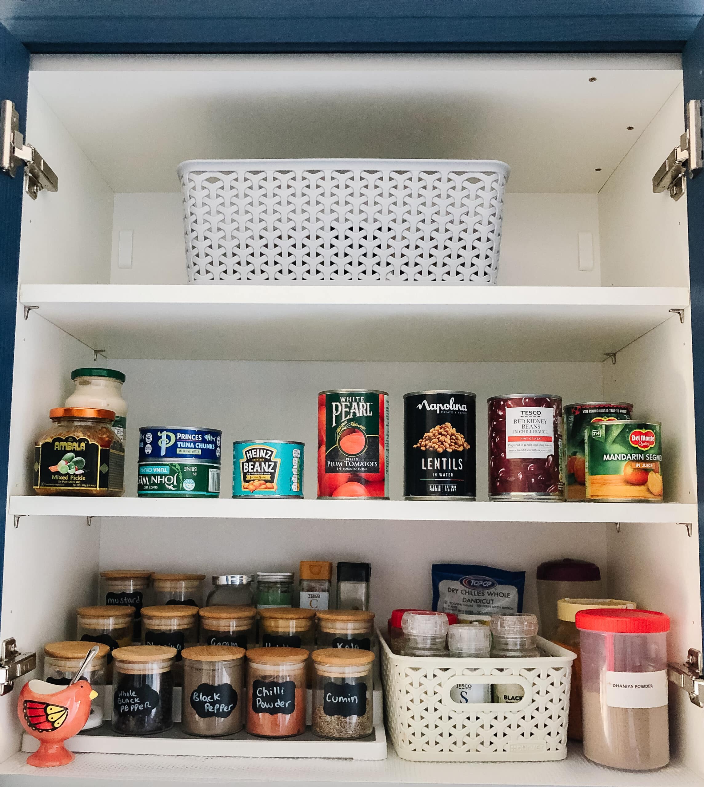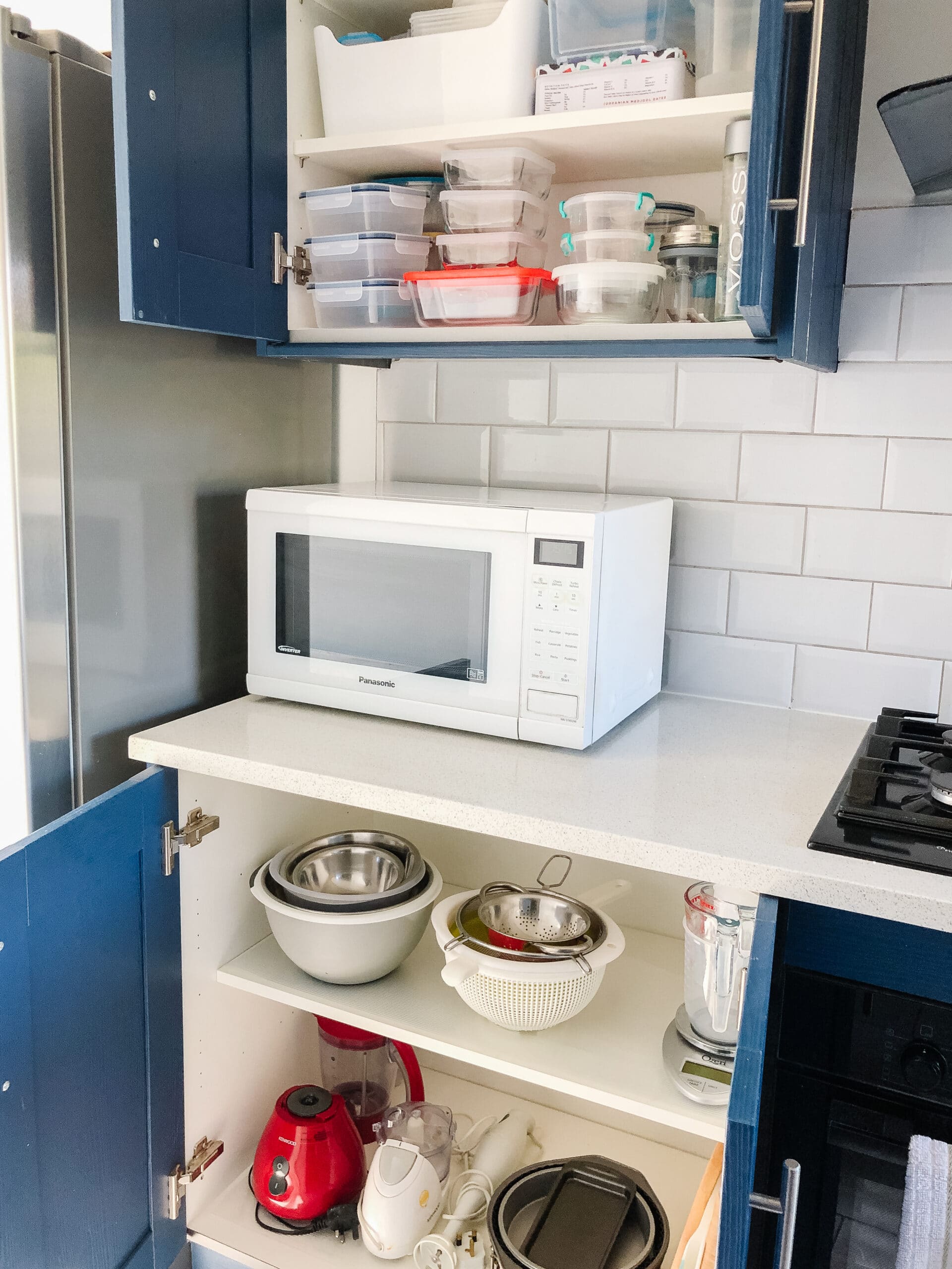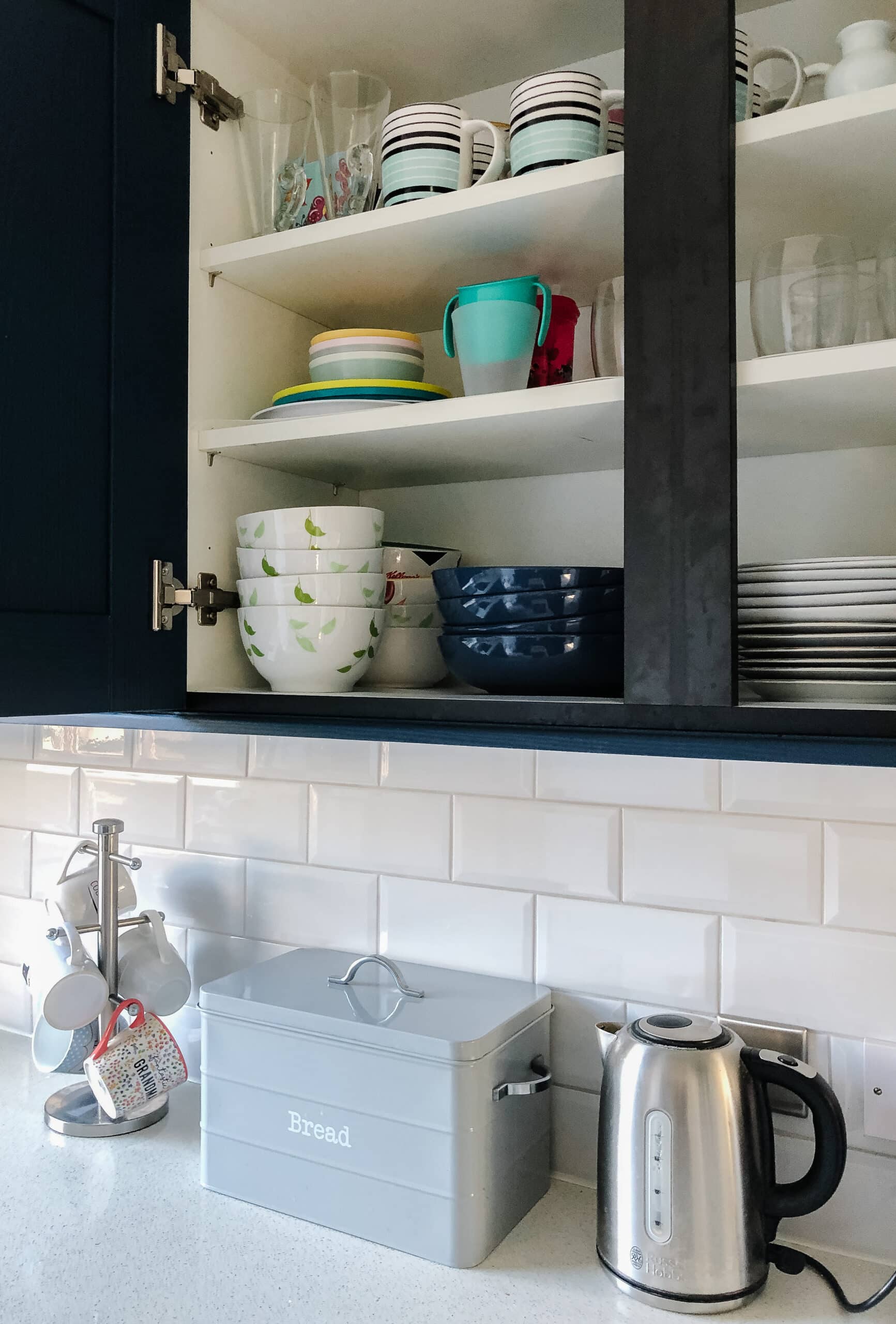To prioritise space for daily items, we moved less-frequently used baking items to a higher cupboard and serveware to a display cabinet in the dining room. This meant we could create a tea and coffee zone close to the kettle to make the space more efficient.