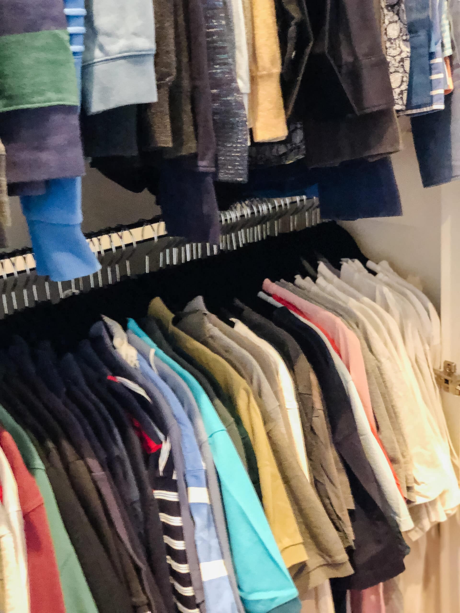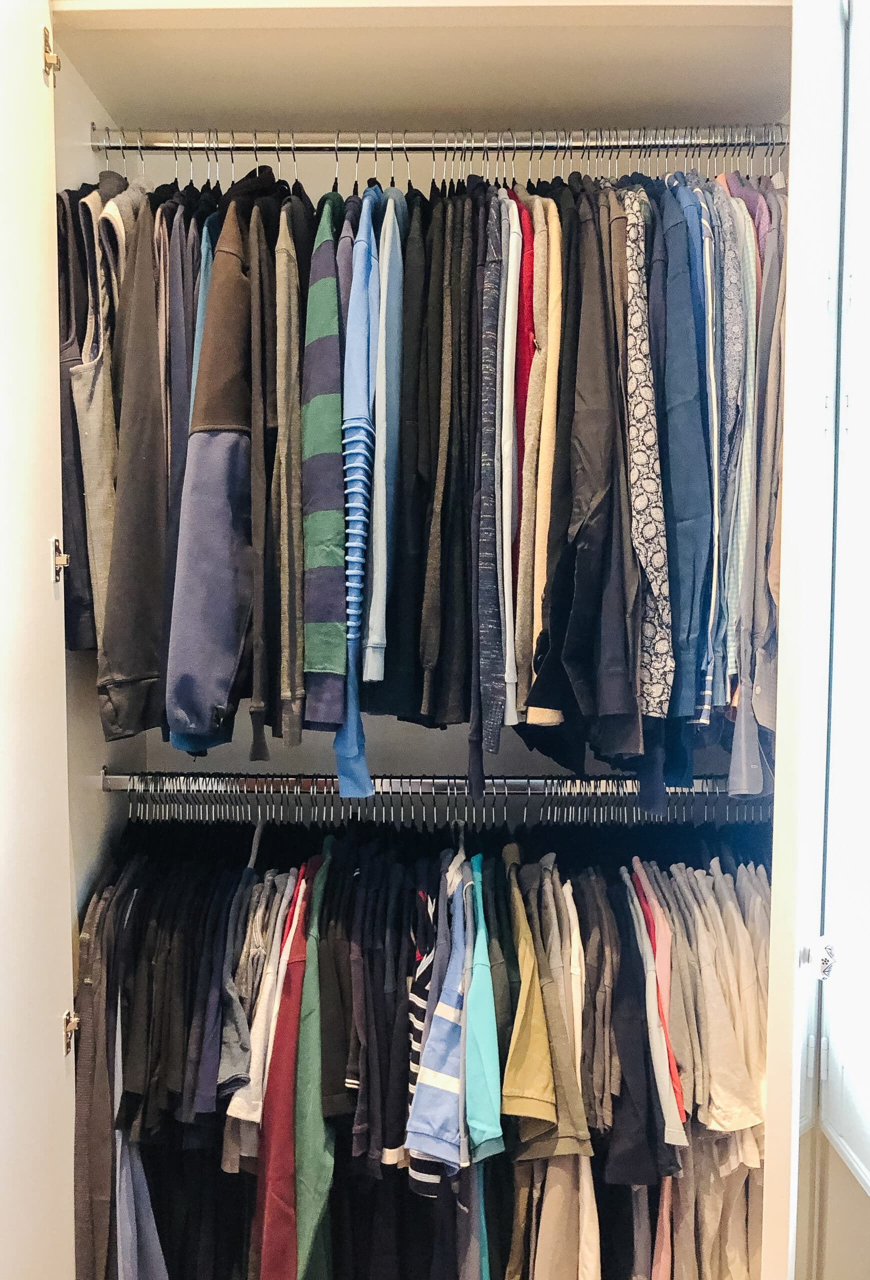 Our client wanted her husband’s wardrobe to be organised for his birthday. She wanted the clothes he wore most often to be easily accessible with the rest being stored out of the way. She also wanted hanging space freed up in the spare-room wardrobe for guests.