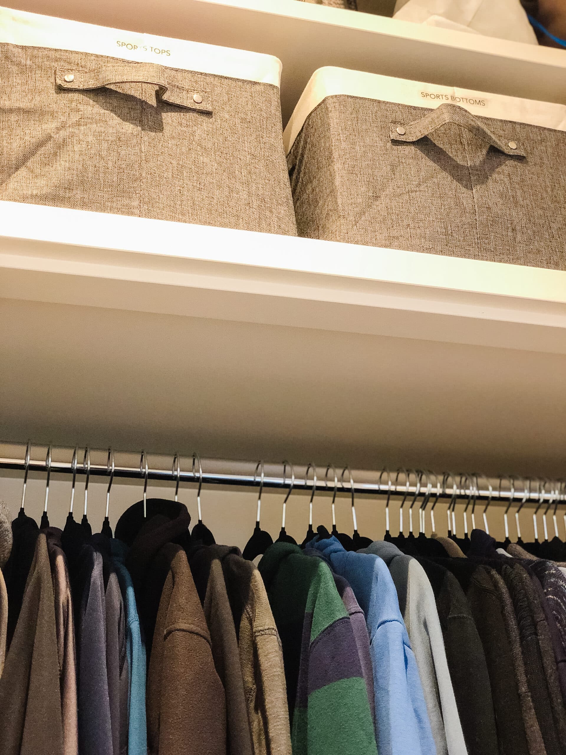 To make better use of the higher shelves, we stored his sports clothes, loungewear and bags in wardrobe boxes that were easy to grab and would prevent items getting lost at the back of the shelf.